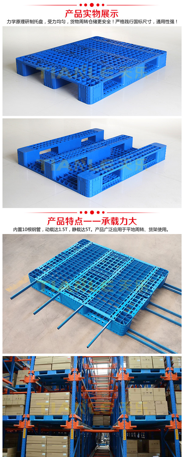 1) 動(dòng)載能力相差0.5噸以上,比如1210川字網(wǎng)格塑料托盤,沒有內(nèi)置鋼管時(shí),動(dòng)載1噸,內(nèi)置鋼管后動(dòng)載能力可以達(dá)到1.5噸以上。